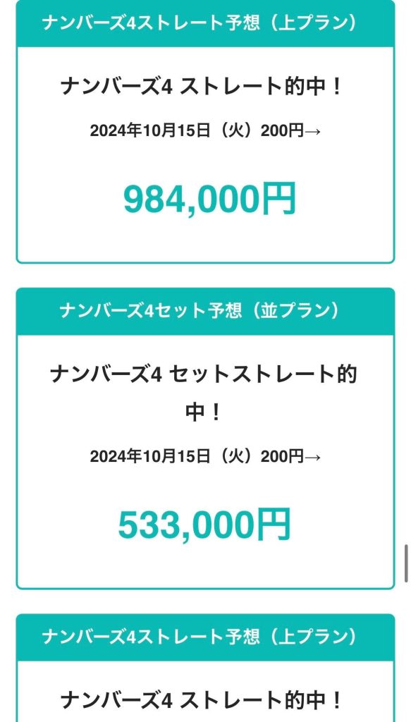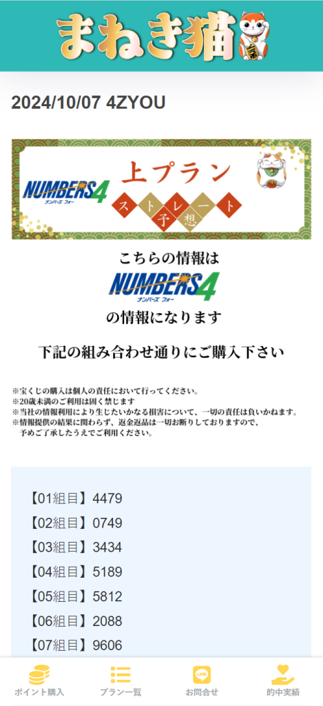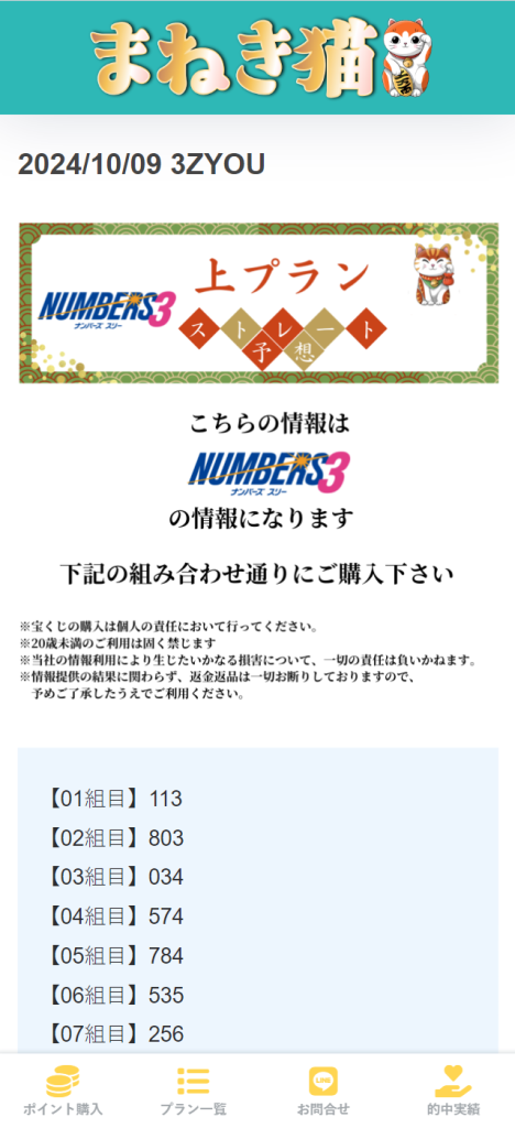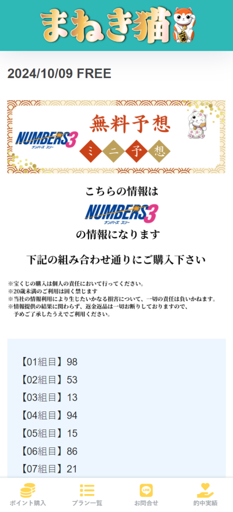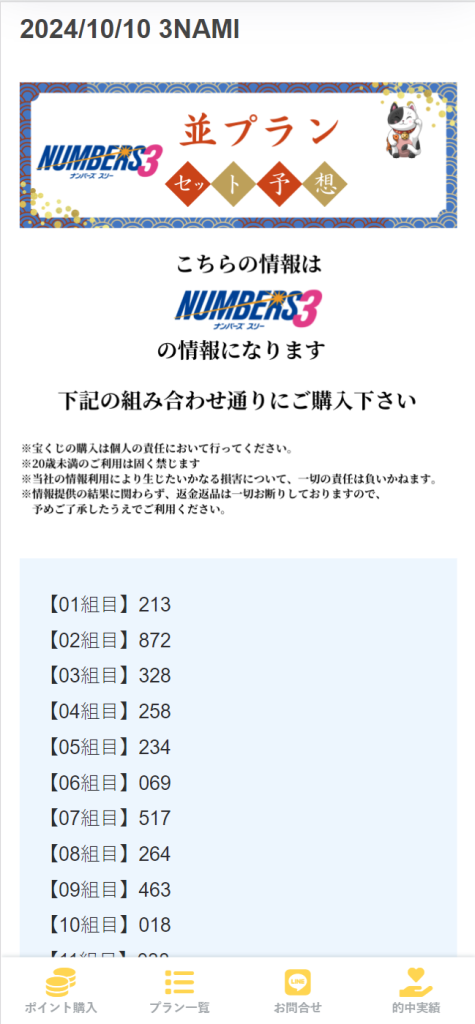 2024年10月10日(木) 参加プラン 無料予想、ナンバーズ3セット、ナンバーズ4ストレート