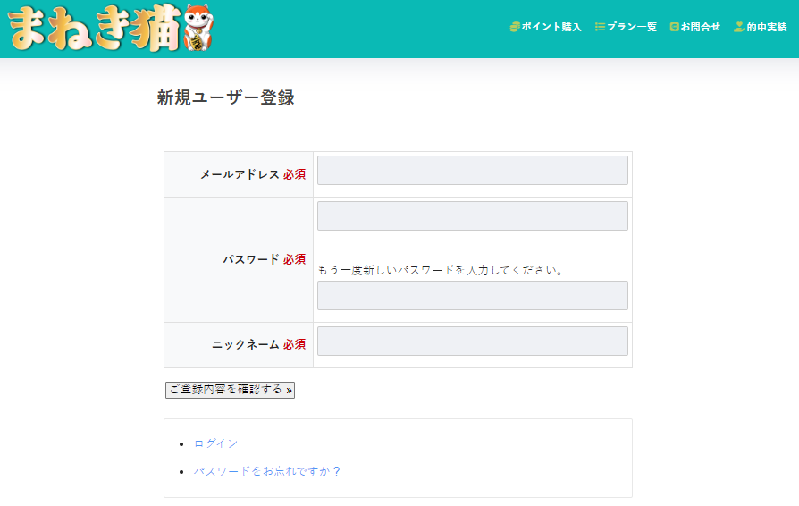 まねき猫の登録ページ
